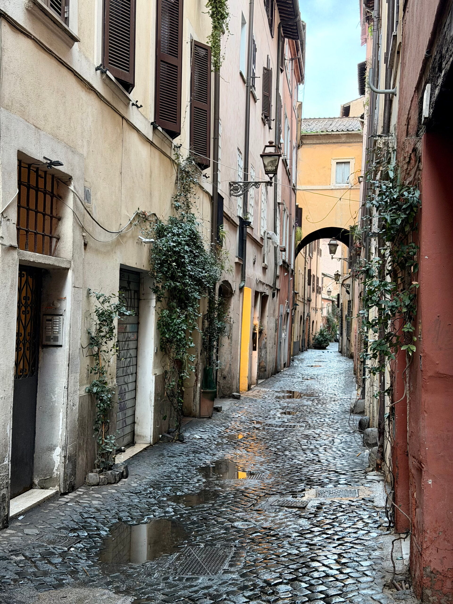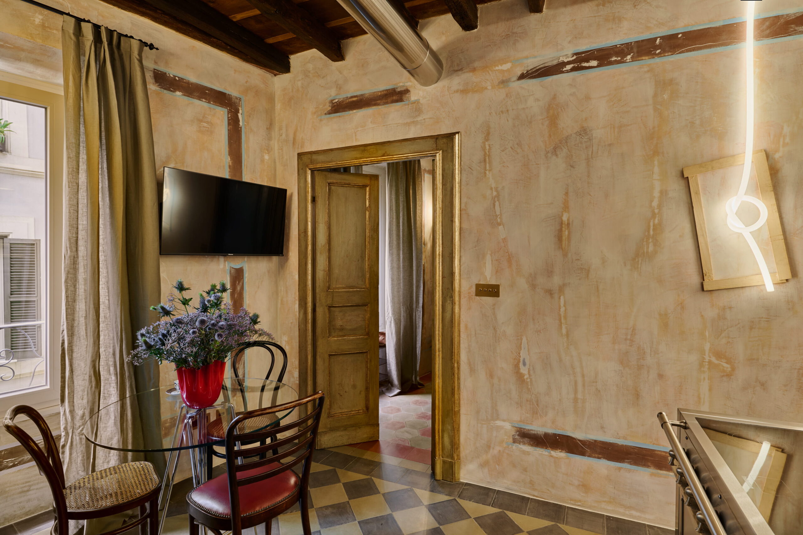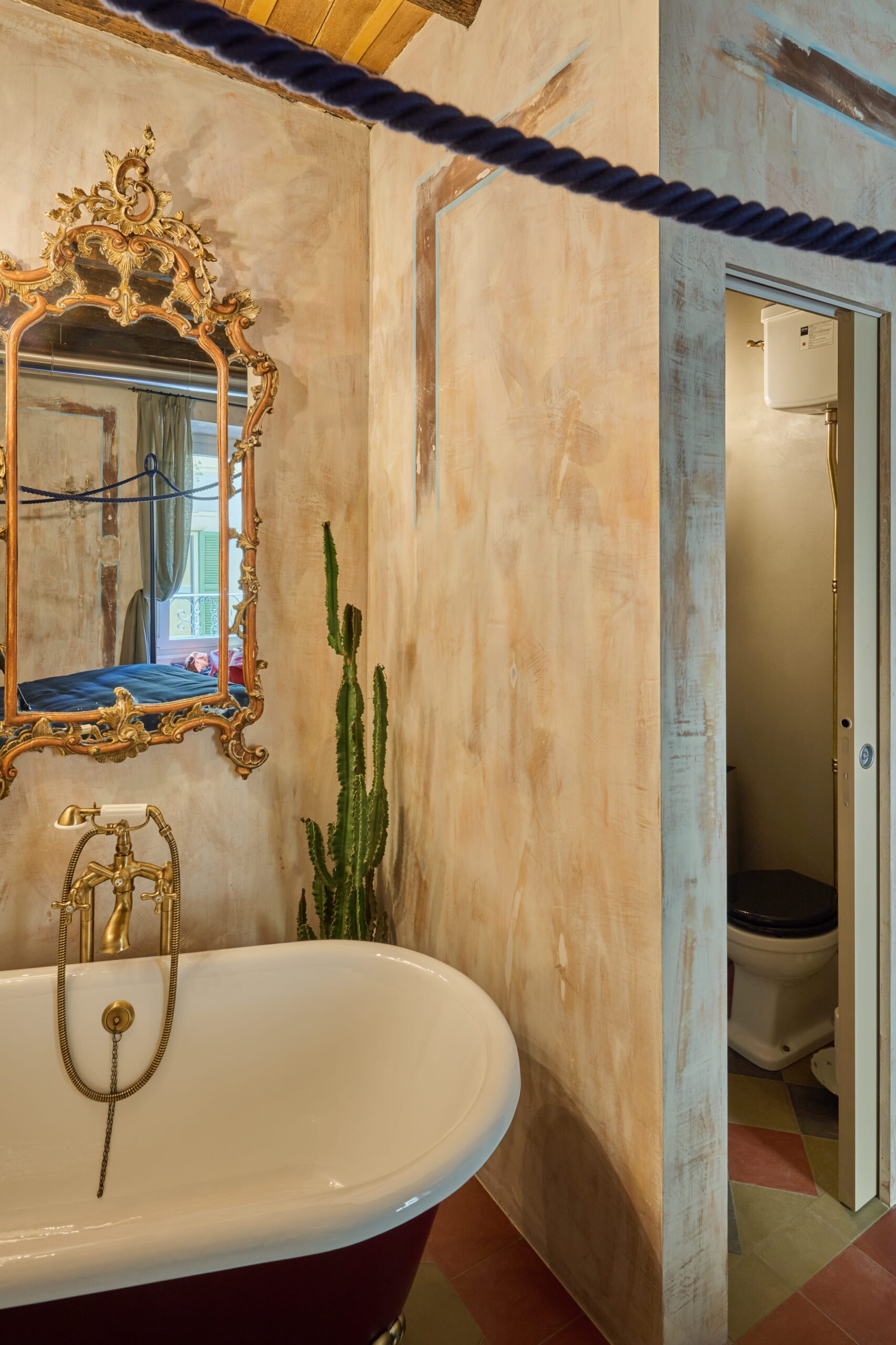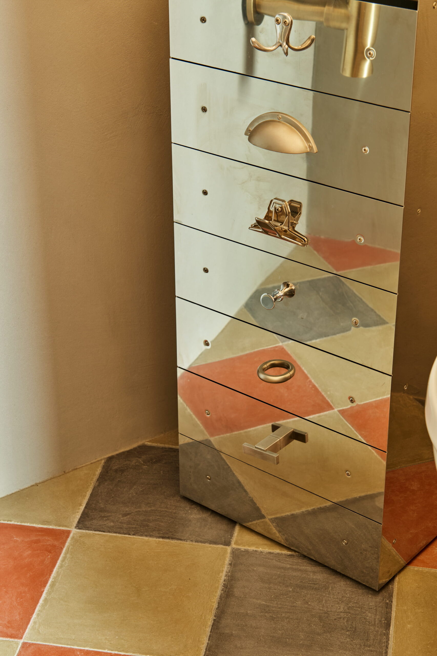 Underfoot, original cement tiles unfold in a muted, time-worn palette: soft greys, warm sand, dusty blues, and hints of terracotta. Their imperfect geometry and faded pigments tell a story of daily life layered over centuries, grounding the contemporary design in Roman authenticity.
