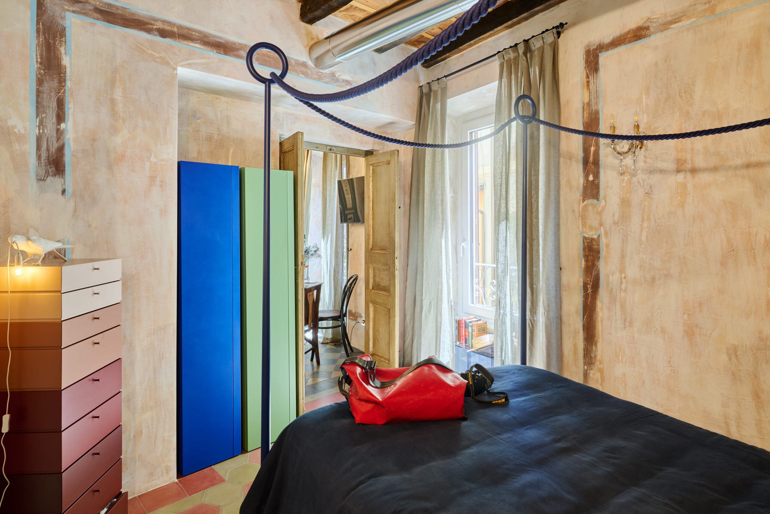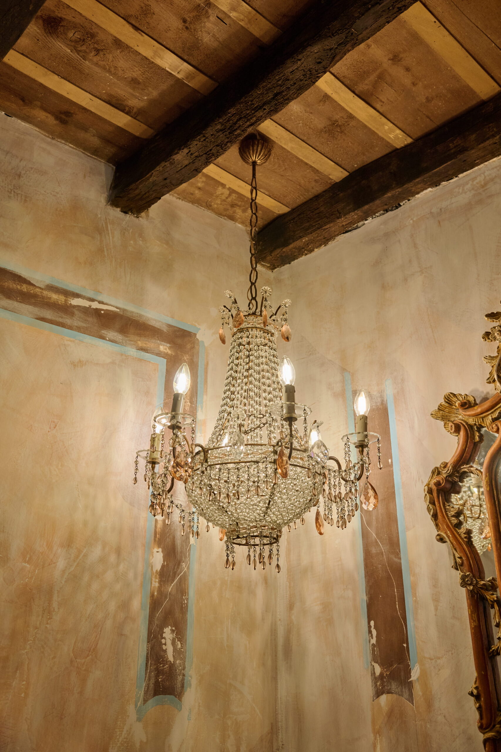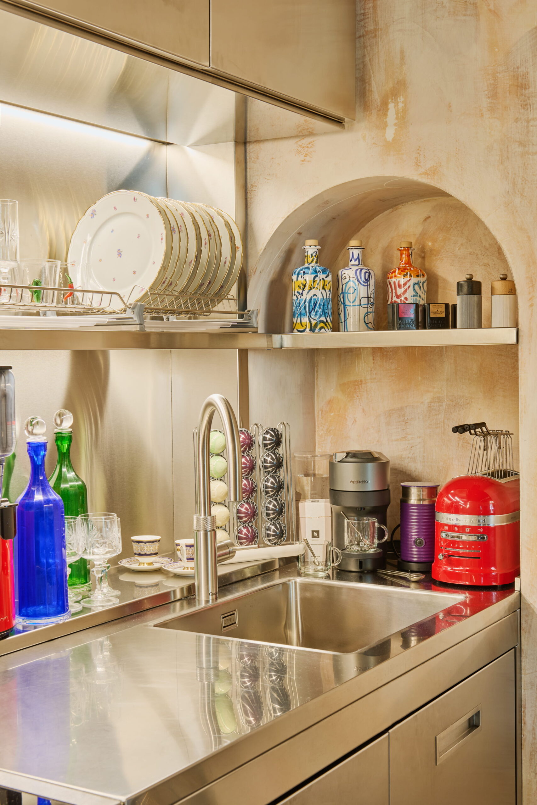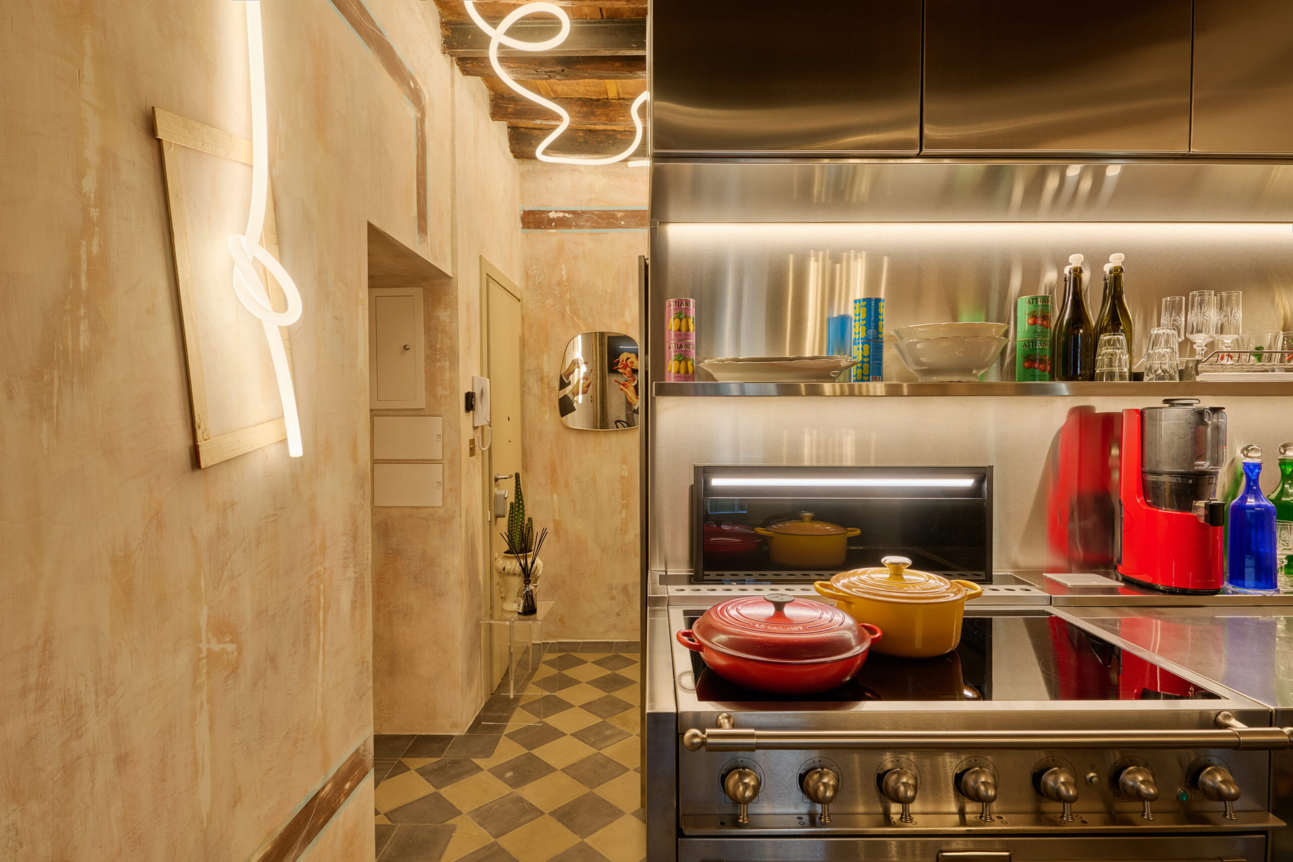 Overhead, the iconic Flos 2097 chandelier by Gino Sarfatti floats like a contemporary constellation, its exposed bulbs casting a soft, graphic glow across the room. A modern counterpoint to the space’s historic soul.