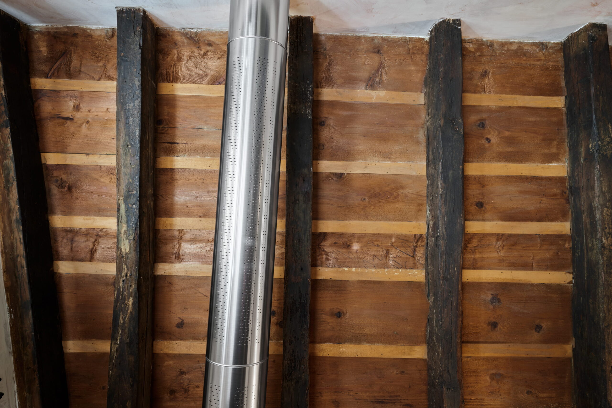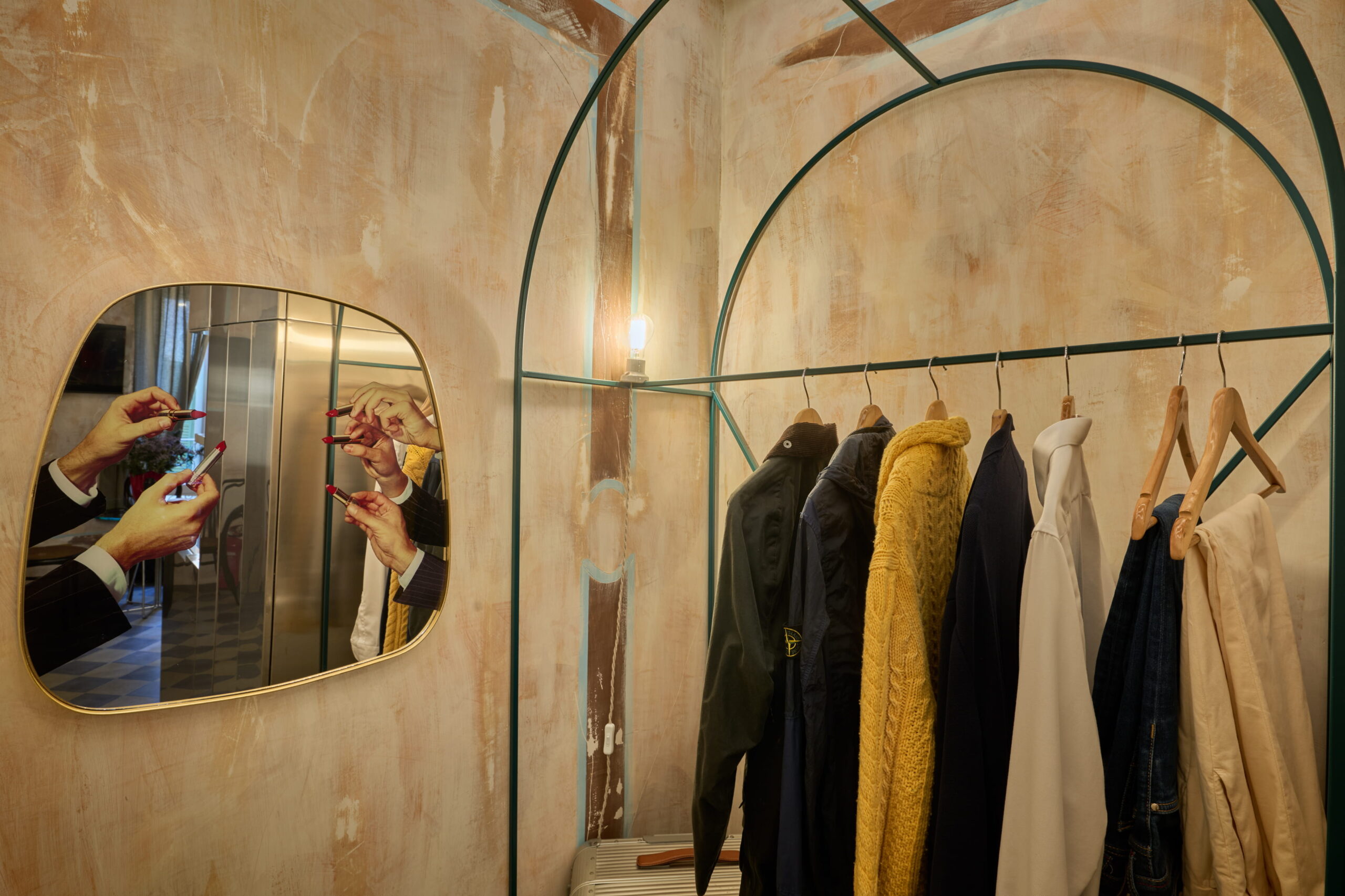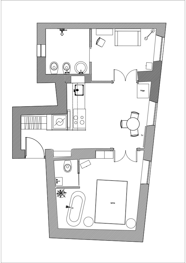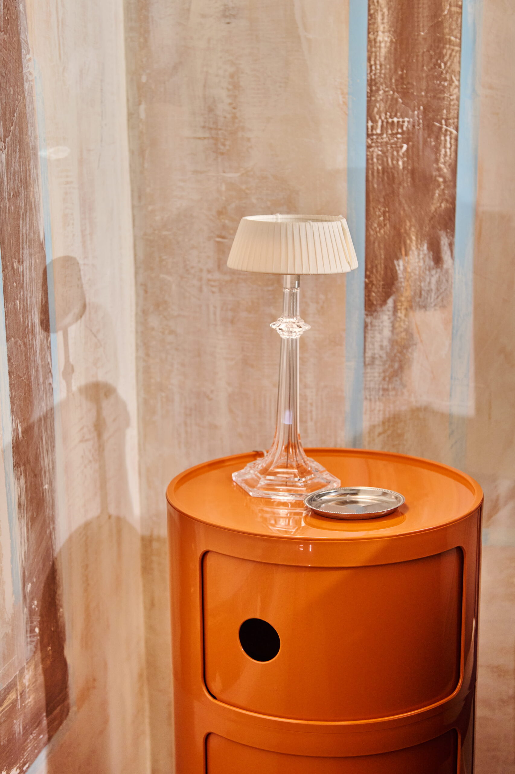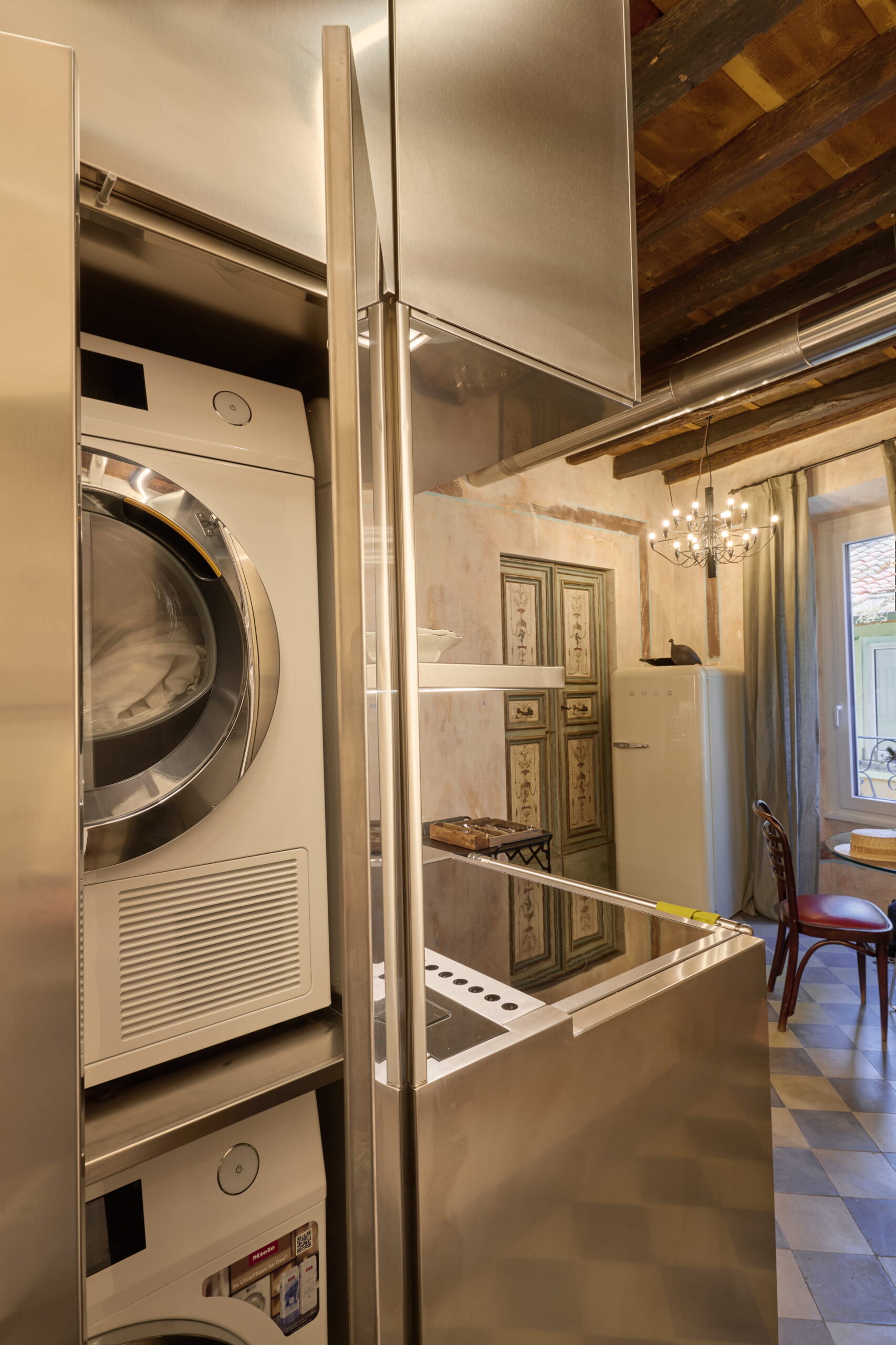 Overhead, the iconic Flos 2097 chandelier by Gino Sarfatti floats like a contemporary constellation, its exposed bulbs casting a soft, graphic glow across the room. A modern counterpoint to the space’s historic soul.