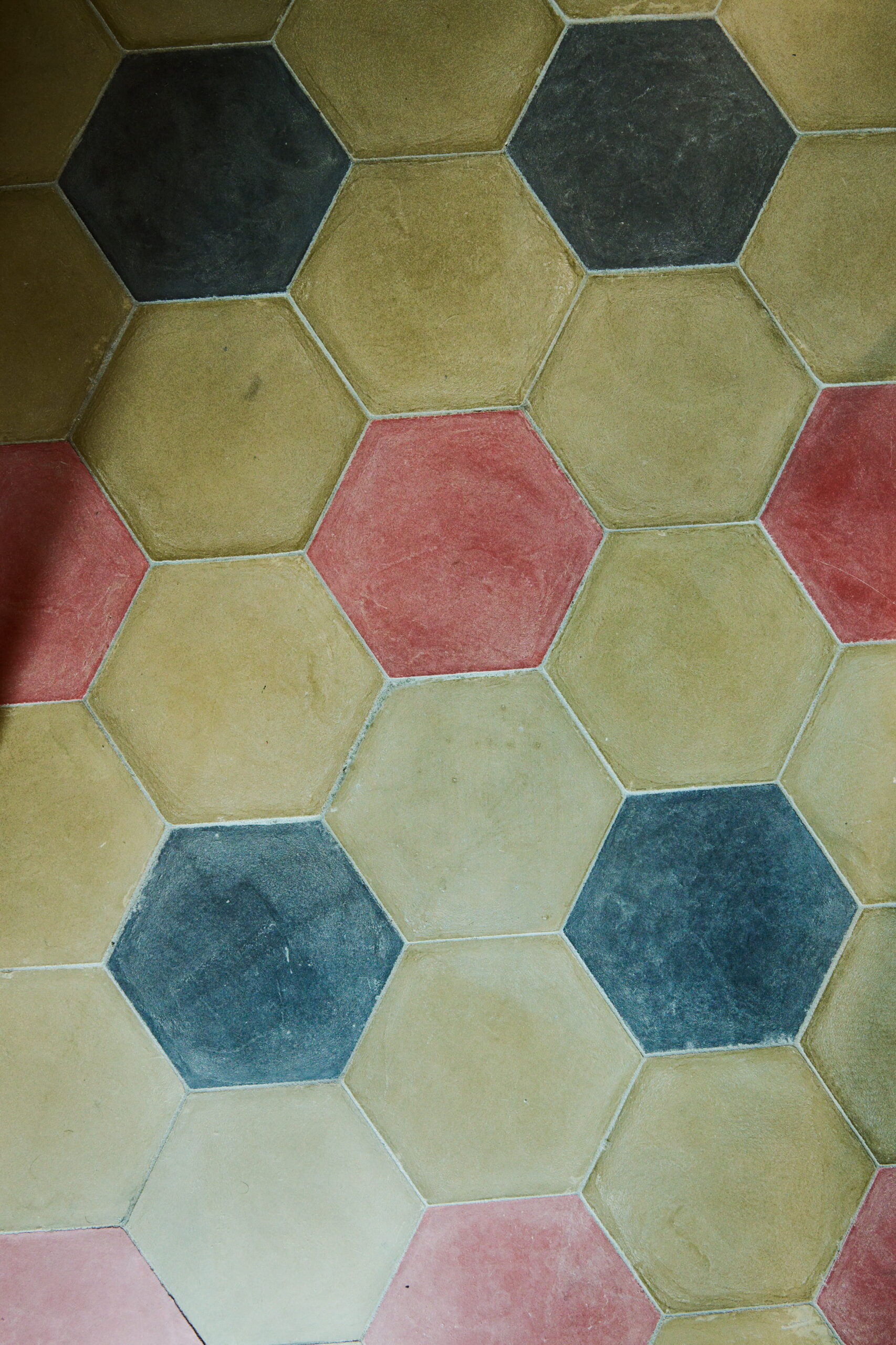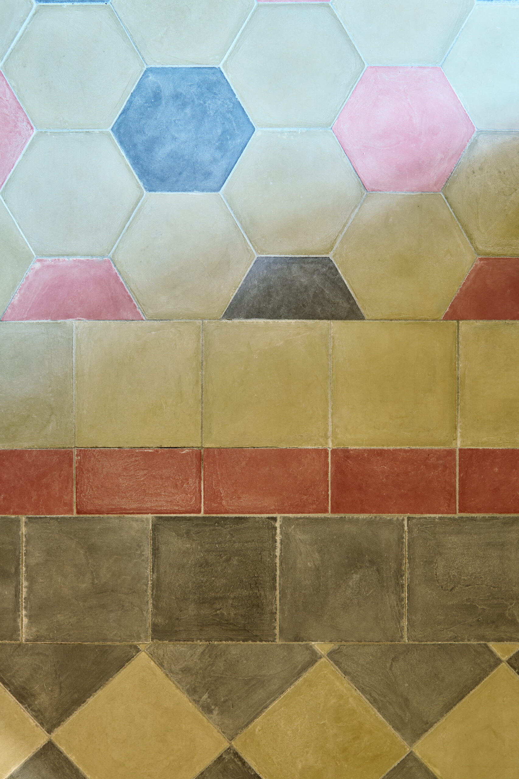 -Original cement tiles, chromatic palette of soft greys, warm sand, dusty blues, and terracotta tones.